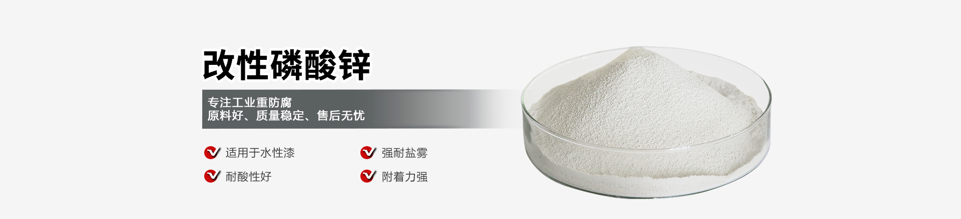 改性磷酸鋅根離子與鋼鐵表面的鐵離子反應(yīng)產(chǎn)生磷酸鐵鉻鹽,這層鉻鹽牢固地附著在鋼鐵表面,可形成以磷酸鐵為主體的堅固的保護(hù)膜,這種致密的鈍化膜不溶于水、硬度高,附著力優(yōu)異,呈現(xiàn)出優(yōu)良的防銹性能,從而保護(hù)鋼鐵。本產(chǎn)品外觀呈白色或者淺黃微晶粉末,不含鉛、鉻等重金屬,屬環(huán)保產(chǎn)品。經(jīng)過進(jìn)口助劑覆膜在10%的鹽酸中無反應(yīng),耐酸性能進(jìn)一步得到提升。