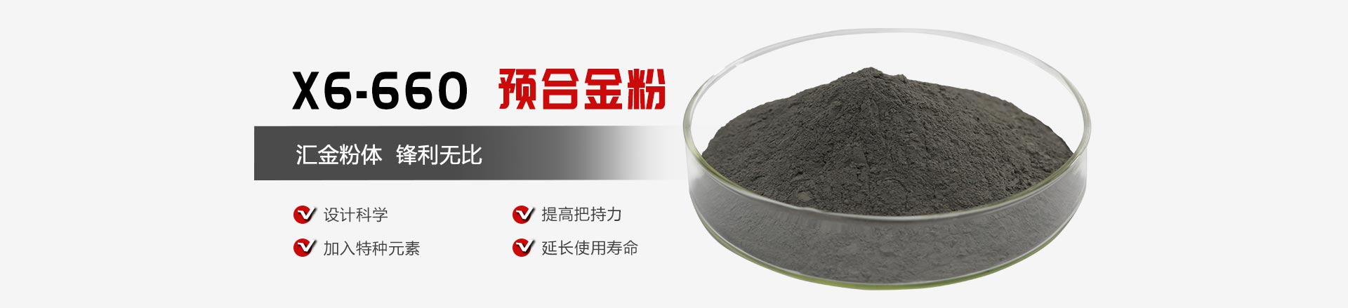 成分設(shè)計(jì)科學(xué)合理,特種元素的加入對胎體組織進(jìn)行改性,對金剛石把持力和工具壽命大幅提升。