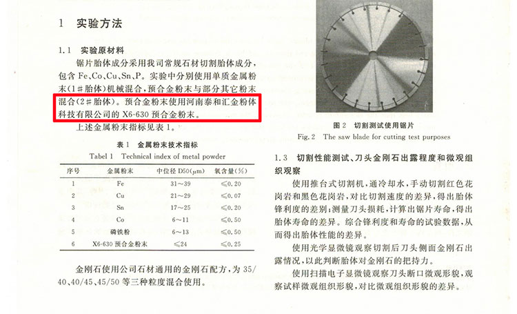 文中作者指出:與單質粉相比,采用預合金粉制成的刀頭具有組織均勻、顆粒細小、胎體致密化程度高、孔隙少的突出特點。同時刀頭表面照片顯示預合金粉末胎體金剛石出露較單質粉高,對金剛石的把持力高,因此工具的鋒利度和壽命較高。鋸切試驗表明以花崗巖為鋸切對象,采用預合金粉X6-630制備的金剛石工具與單質粉相比鋒利度和壽命均可提高15%以上,顯著提高了工具的綜合性能和品質。這有力地印證了河南泰和匯金粉體科技有限公司預合金粉末系列產品的匠心品質和優越性能。