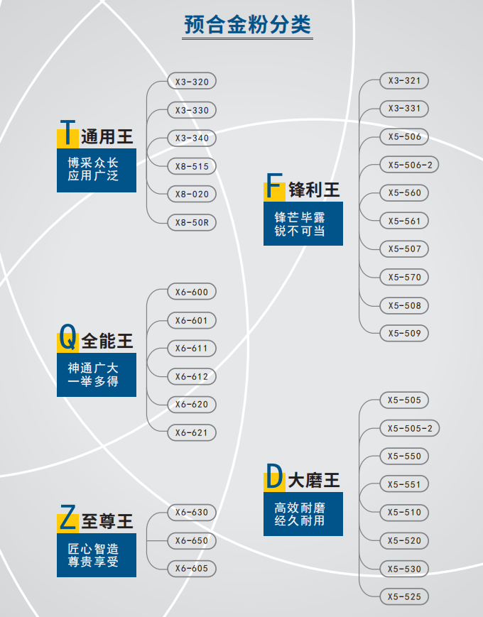 立足行業,不負信賴,為了給客戶提供更加個性化的產品和貼心高效服務,2021年,泰和匯金通過定位理論重構預合金粉產品體系,細分出通用王、鋒利王、全能王、大磨王、至尊王五大產品系列,持續為客戶創造價值。其中,X6-630就歸屬于預合金粉至尊王系列,意在匠心智造,為客戶提供尊貴享受,全面提升工具品質。